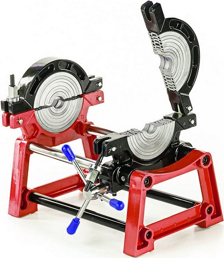- Центратор с 2-мя откидными зажимами и фиксатором имеет большой запас прочности за счет качественного сплава и ребер жесткости, что позволяет сваривать полимерные трубы с любым показателем SDR