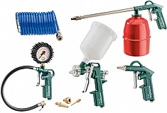 Набор пневматических инструментов Metabo LPZ 7 SET (Метабо ЛПЗ 7 СЕТ) состоит и продувочного пистолета, измерительного прибора для накачивания шин, в том числе из адаптера и трубчатой иглы, пистолета-краскораспылителя с поточным стаканом, распылительного пистолета и спирального шланга РА Set.