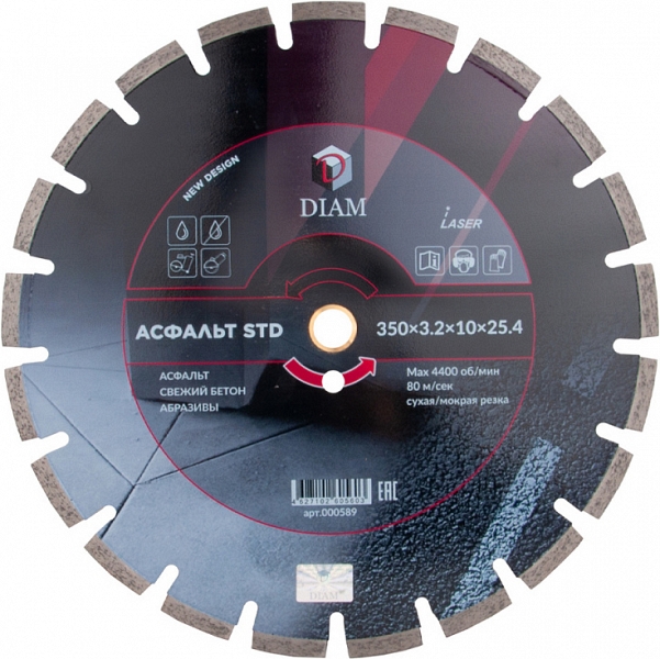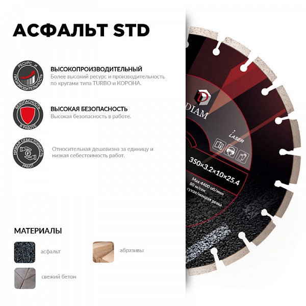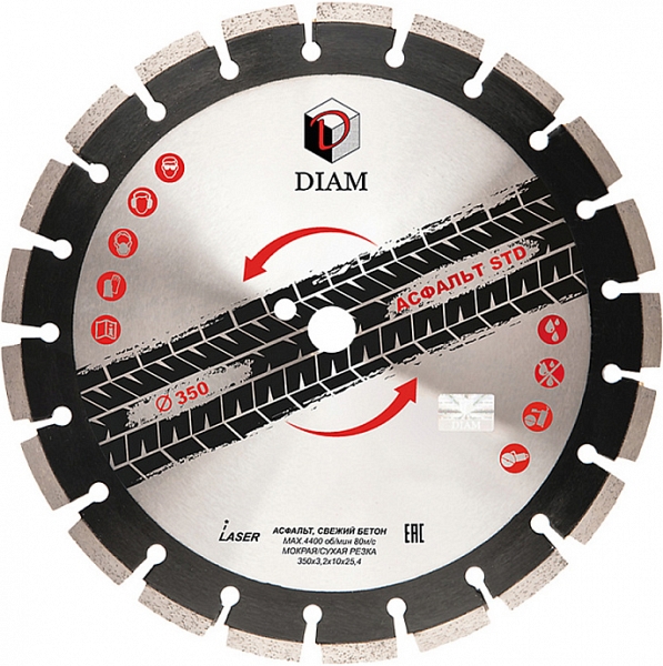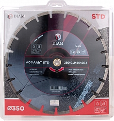 Модель снята с производства! Сегментный алмазный круг Diam STD 1A1RSS Асфальт 350 мм (Диам СТД 1А1РСС Асфальт 350 мм) – профессиональный алмазный отрезной диск для сухой и мокрой резки асфальта, свежего бетона и других абразивных материалов на резчиках швов, стенорезных машинах, камнерезных станках, электрических резчиках, бензорезах, как с подачей воды, так и без нее.